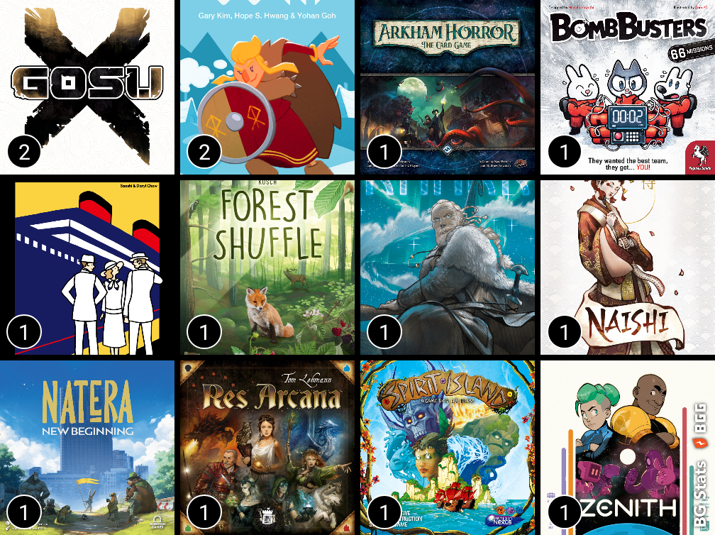 Petit mois de mon côté. Gosu X : pas une nouveauté, mais content d'avoir mis la main dessus pour pas cher. J'aime beaucoup dans le genre, rapide et le mixte des clans apporte beaucoup de variété. Arkham Horror : je lui ai redonné une deuxième chance, mais c'était la dernière. Plate, long, répétitif, peu de décision à prendre, très hasardeux. Bomb buster : c'est cool, mais à jouer seulement à 4 joueurs ou 5. Avoir 2 plateau tue le jeu pour moi... Naterra : très bon dans le style engine building avec un gros paquet de cartes. Il reste derrière TM, mais est plus intéressant que wingspan, earth,...6 points