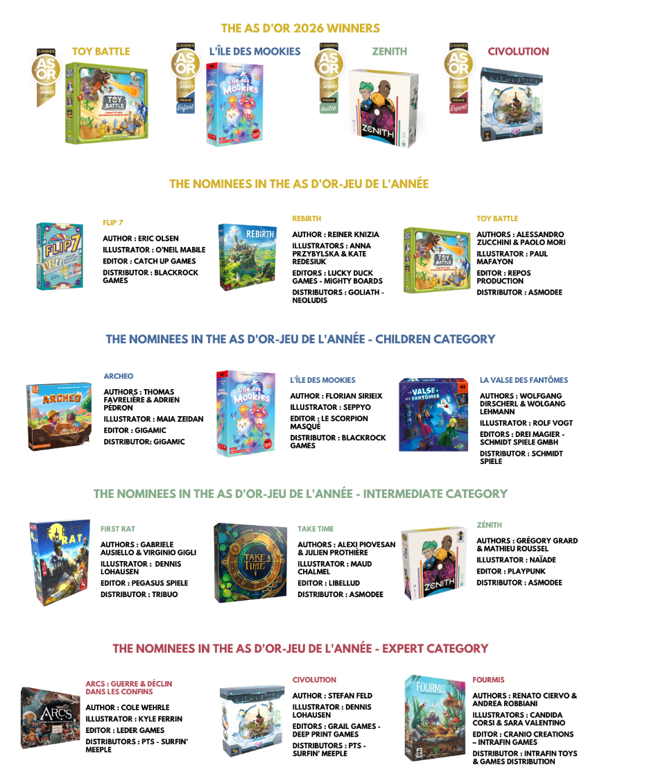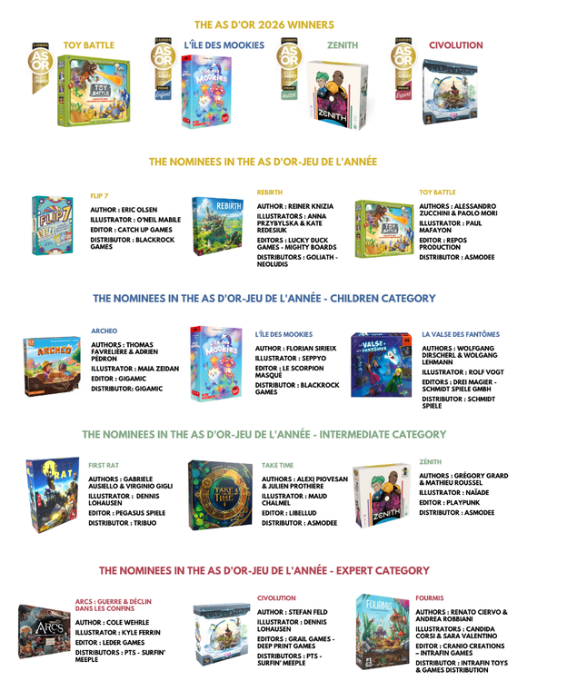 Grand Public :J'aime beaucoup Toy Battle. Rebirth est très bien aussi, mais Toy Battle a un petit quelque chose. Initié : J'ai plus accroché à Take Time un peu que Zenith, mais Take Time sera plus hit or miss à mon avis. C'est quand même un genre "mathématique" qui ne plaît pas à tout le monde (genre ma blonde). First Rat ne m'a pas du tout impressioné. Expert : Civolution est super bon. Fourmis aussi. Je n'ai pas capoté sur Arcs, donc bien satisfait de la sélection.