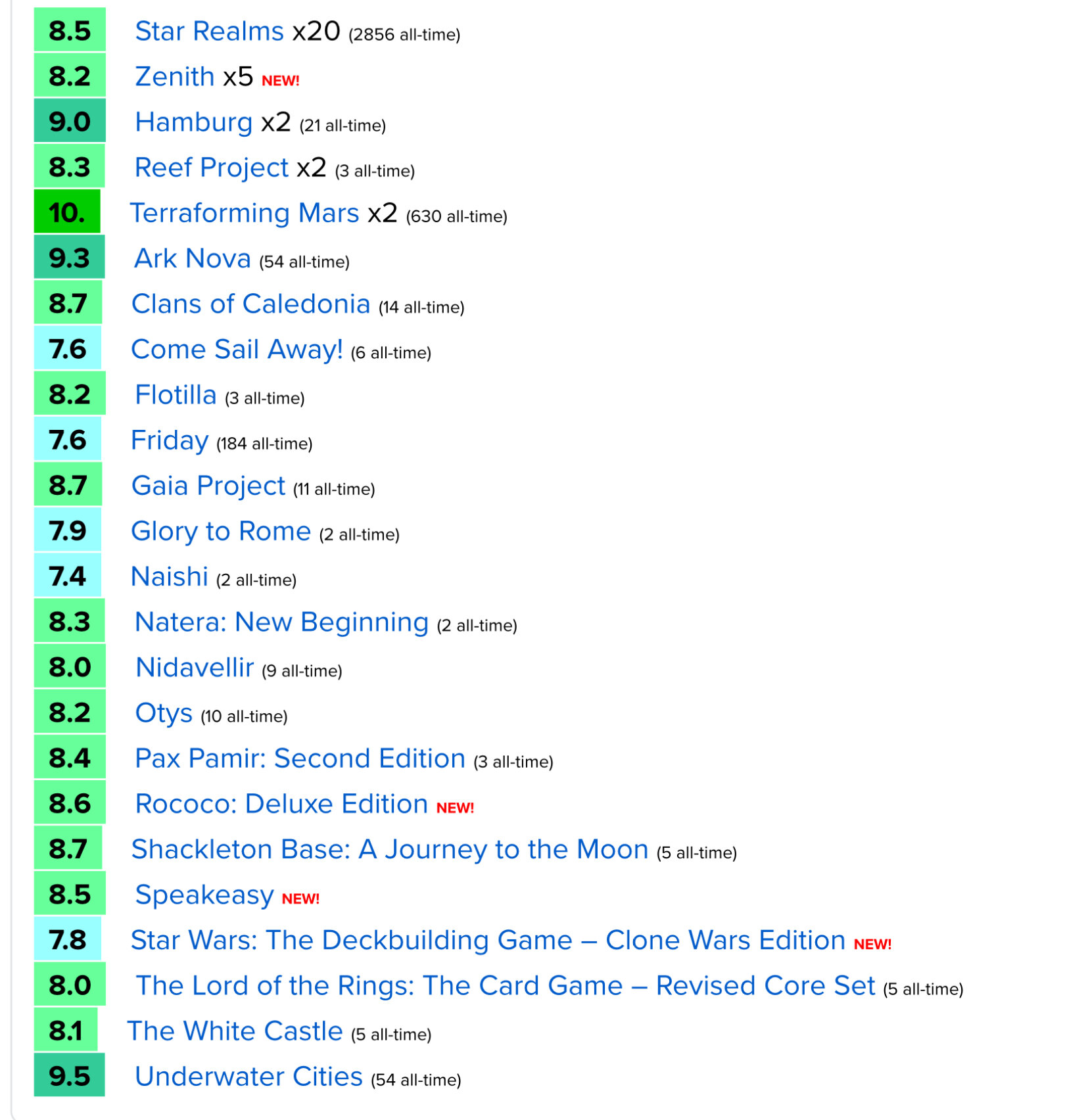 Mes plus joués: 1-Terraforming Mars, ne se démode pas. 2-Civolution, un grand Feld, que du plaisir! 3-Hamburg, Bruges 2.0, qui vient de prendre du galon car j'ai enfin testé l,extension des bateaux! 4-Underwater Cities, toujours aussi bon 5-Black Forest, vraiment un excellent Uwe, et qui se joue en peu de temps. 5- Shackleton Base, a égalité. Excellent jeu! mon top 2 de l'année! -