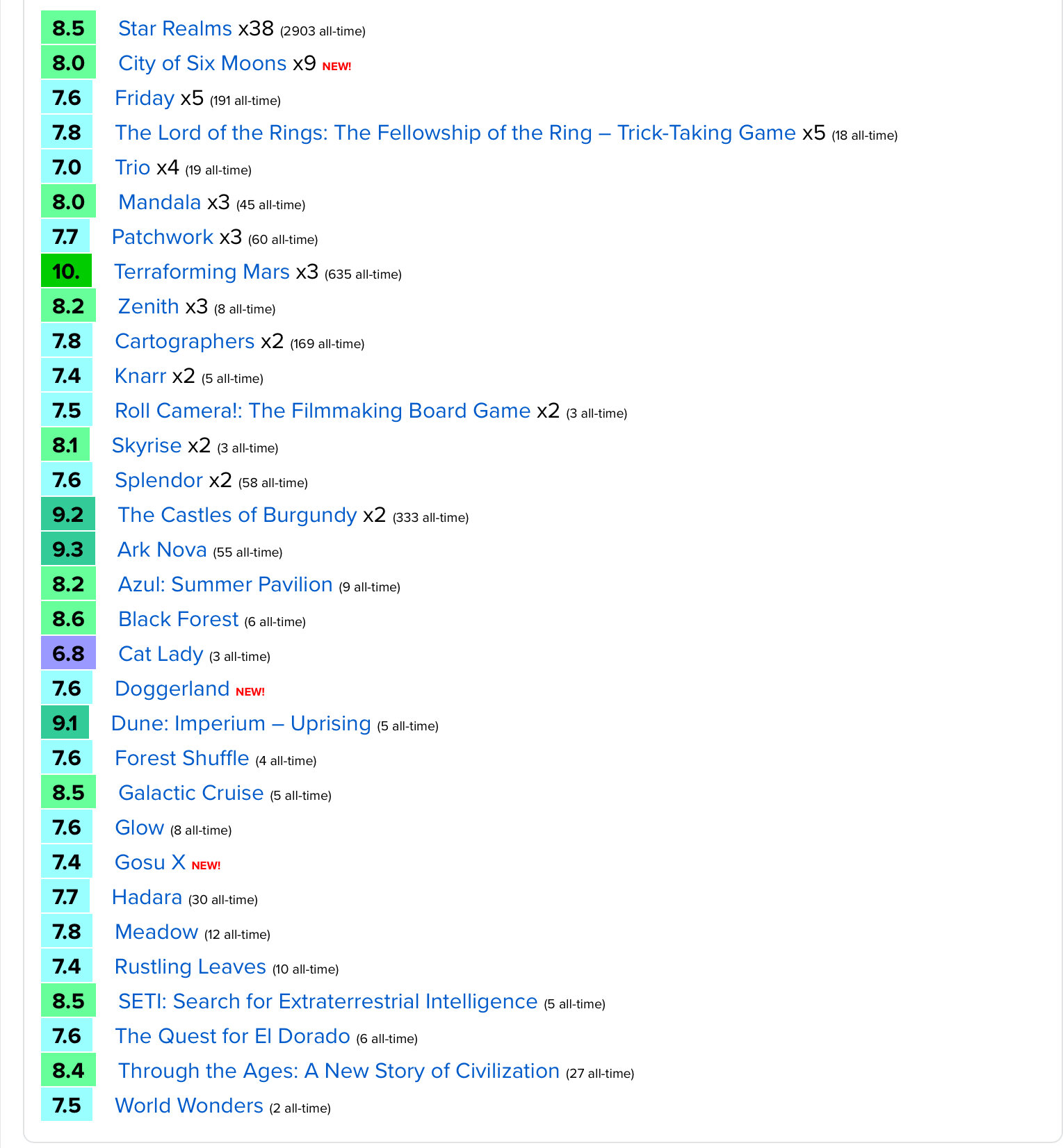 Tawny Posted February 2 Posted February 2 Mon meilleur mois de janvier depuis des années. Une fin de semaine au chalet ça aide pas mal! Odin x3 (18 all-time) GOLDblivion x2 NEW! Ginkgopolis x2 (8 all-time) Hitster: Music Bingo x2 (4 all-time) Terraforming Mars x2 (17 all-time) 1906 San Francisco NEW! Battle for Rokugan NEW! Brian Boru: High King of Ireland (2 all-time) Coloretto (37 all-time) Come Sail Away! NEW! Dune: Imperium – Uprising (3 all-time) Emblems (2 all-time) Great Western Trail: New Zealand (4 all-time) Hallertau NEW! Kanban: Driver's Edition (4 all-time) Natera: New Beginning NEW! Présages (6 all-time) Revive (3 all-time) SCOUT (18 all-time) SETI: Search for Extraterrestrial Intelligence (4 all-time) Stockpile (10 all-time) Take Time NEW! The Castles of Burgundy (3 all-time) Through the Ages: A New Story of Civilization (23 all-time) Meilleures nouveautés: Hallertau : je n'ai plus d'attentes pour les nouveau gros jeu de Rosenberg. Bien aimé celui-là. GOLDblivion : n'invente rien mais j'aime ce genre de jeu. Natera: New Beginning : un autre qui n'invente rien. J'ai aussi des doutes sur l'équilibre de certaines actions, mais quand même bien plaisant. Les vieilleries que j'étais content de ramener à la table: Terraforming Mars : Ark Nova l'avait poussé dans le fond de la tablette mais il y a de la place pour les 2. Surtout avec Prelude! Through the Ages : pas certain qu'il reverra beaucoup la table considérant la leçon militaire donné à un des joueurs. Ça reste le défaut de ce jeu: il ne faut jamais tomber trop loin derrière dans le militaire... The Castles of Burgundy : excellent et tellement rapide à 2 joueurs. Ginkgopolis : toujours aimé ce jeu même si dans le fond c'est un jeu abstrait. iulius, Rémimique, austin power and 8 others 11